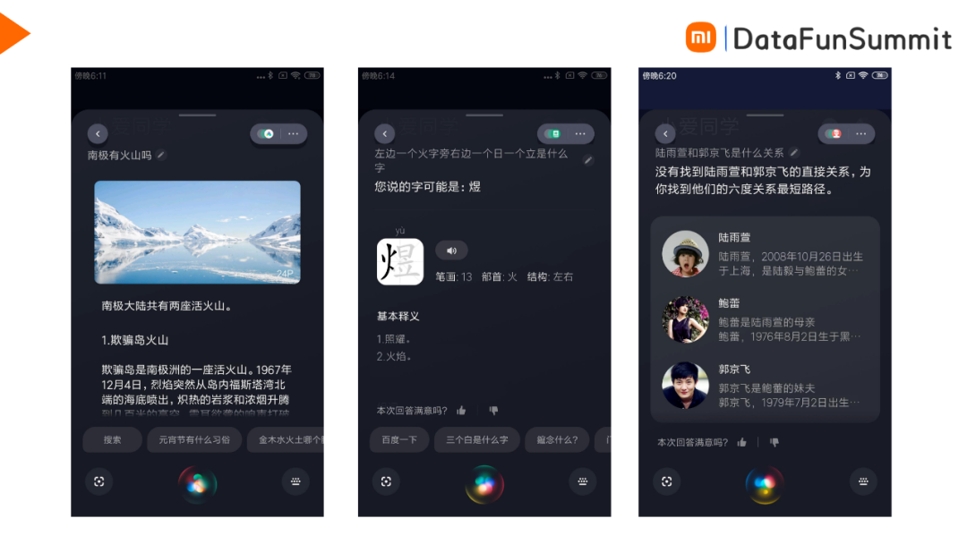 小爱同学具体的垂域功能有语音控制、音乐、闲聊、时间、智能问答等。例如,用户可以通过语音控制来指挥家里的小米电视、扫地机器人等;用户可以通过小爱音箱来享受音乐;用户可以和小爱同学进行对话以及查询服务等。在本次分享中介绍的智能问答系统,针对的是有客观事实性答案的Query,主要是用来满足用户信息查询类的需求,简单来说就是用户询问一个知识类的问题,系统会基于庞大的知识库来给出相应的答案。如下图所示为产品效果图,比如,当用户询问陆雨萱与郭京飞是什么关系时,系统会从图谱中找到两者的关系路径,向用户回答鲍蕾是陆雨萱的母亲,郭京飞是鲍蕾的妹夫,这样就展现出两者之间间接的关联关系,用户假如对其中的中间人物感兴趣,可以点进去进一步的浏览。