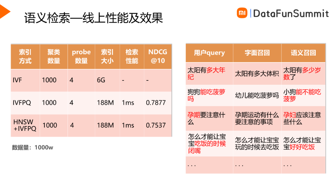 如下图所示是语义检索性能与效果的实验对比,在1000w的数据下,IVF检索的内存占用是6G,内存占用偏高。IVFPQ的内存占用下降到188M,检索耗时是1ms,HNSW+IVFPQ在内存占用与检索性能上相差不大,在效果上稍差,最终我们选用的是IVFPQ的检索方式。通过语义索引可以解决线上的一些badcase,例如“太阳有多大年纪”,term检索通道召回的可能是“太阳有多大体积”,通过语义检索可以召回“太阳有多少岁数了”。