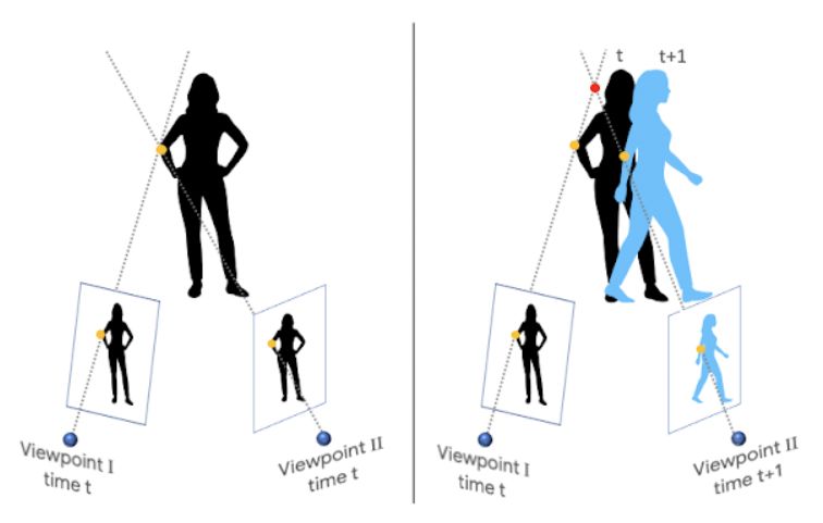 左图:传统的立体设置假设至少有两个观察点在同时捕捉场景。右图:我们考虑摄像头和拍摄对象都在移动的情况。