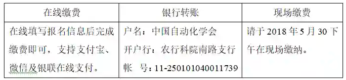 ①2018年05月29日(含)前注册并缴费:自动化学会会员2000 元/人,非会员报名同时入会2500元/人;②现场缴费:会员2500元/人,非会员3000元/人(包含提前报名现场缴费、现场报名现场缴费);③在校生参会可享受学生优惠价格1200元/人;④公务卡缴费可现场刷卡,但需要提前提交报名信息方可按优惠价格缴费;⑤自动化学会团体会员参加,按会员标准缴费;⑥同一单位3人及以上团体报名,按会员标准缴费。