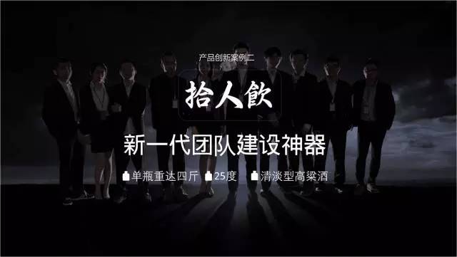 第二款产品:拾人饮。这款单瓶重达四斤、只有25度的清淡型高粱酒聚焦很小的市场细分领域:单位的团队建设,如开阅读会、年会、部门聚餐。
