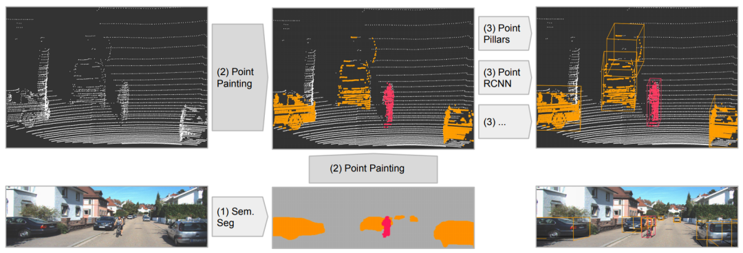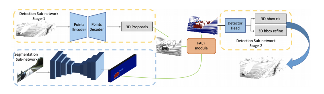 发表在CVPR20,该工作的fusion方式是采用二维语义分割信息通过lidar信息和image信息的变换矩阵融合到点上,再采用baseline物体检测;可以理解为对于语义分割出的物体多了一些信息作为引导,得到更好的检测精度。和上面的pi-rcnn的不同之处是该融合是一个串联的网络结构,将语义分割后的特征和原始点云一起送入深度学习网络中。