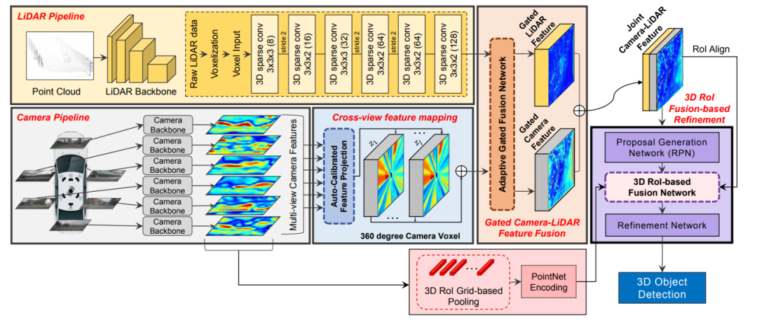 这篇发表在ECCV20的多模态融合的文章网络结构图如下所示,该特征融合阶段为对特征进行融合,同时对于点云的backbone采用voxel-based的方法对点云做特征提取。所以这里需要解决的核心问题除了考虑怎么做特征的融合还需要考虑voxel-center作为特征载体和原始点云坐标存在一定的偏差,而如果将图像信息索引到存在偏差的voxel中心坐标上,是本文解决的另外一个问题。