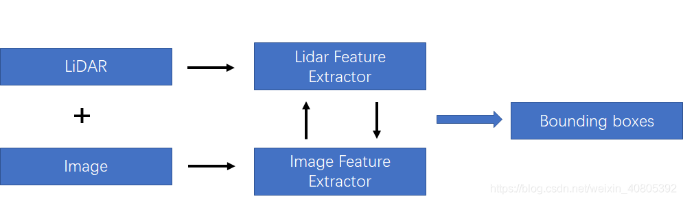 在上一篇文章中,笔者也提及到这种融合方法如下图所示。在后面,笔者将这两种方法都统称为特征融合方法,将late-fusion成为决策融合方法。如下图所示的融合方法,该融合需要在特征层中做一定的交互。主要的融合方式是对lidar 和image分支都各自采用特征提取器,对图像分支和lidar分支的网络在前馈的层次中逐语义级别融合,做到multi-scale信息的语义融合。