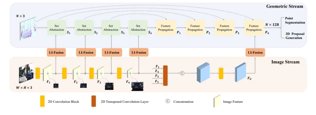 发表在ECCV20的文章,如下图所示,其网络结构点云分支是point encoder-decoder的结构,图像分支则是一个逐步encoder的网络,并且逐层做特征融合。
