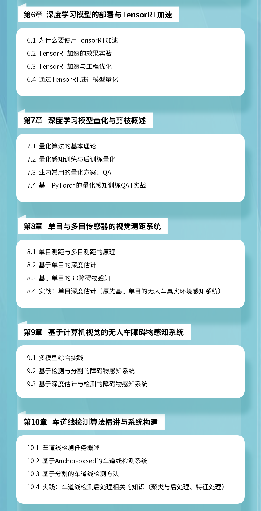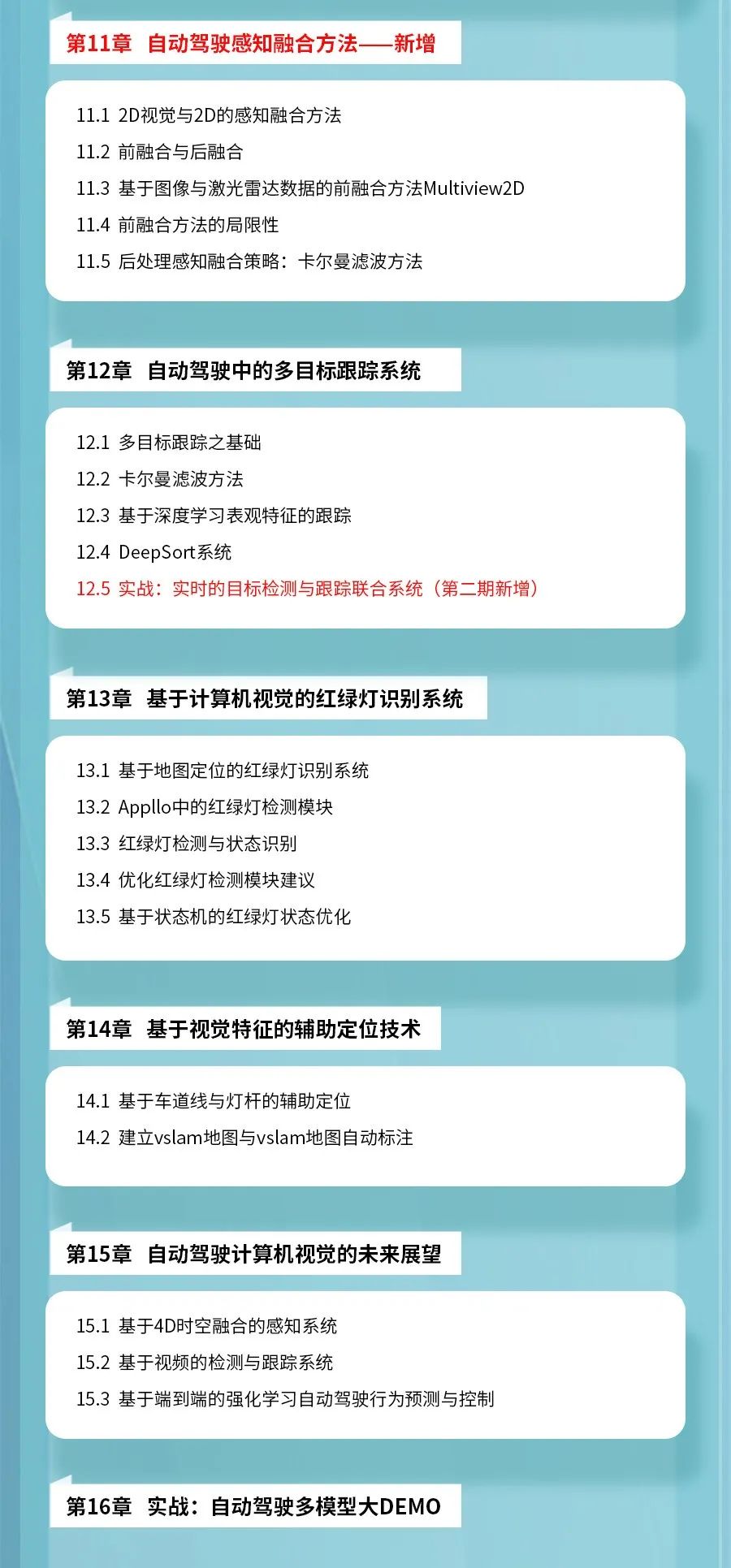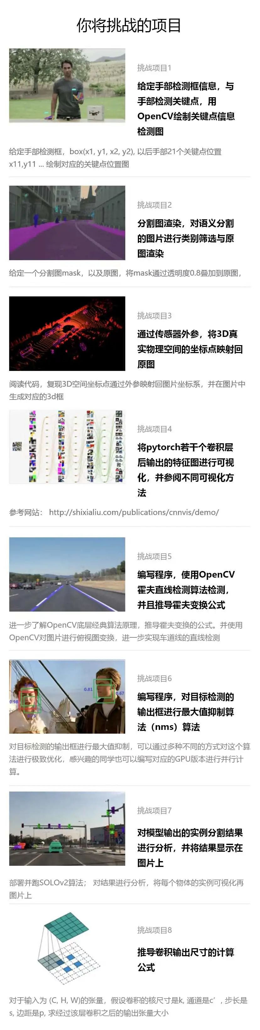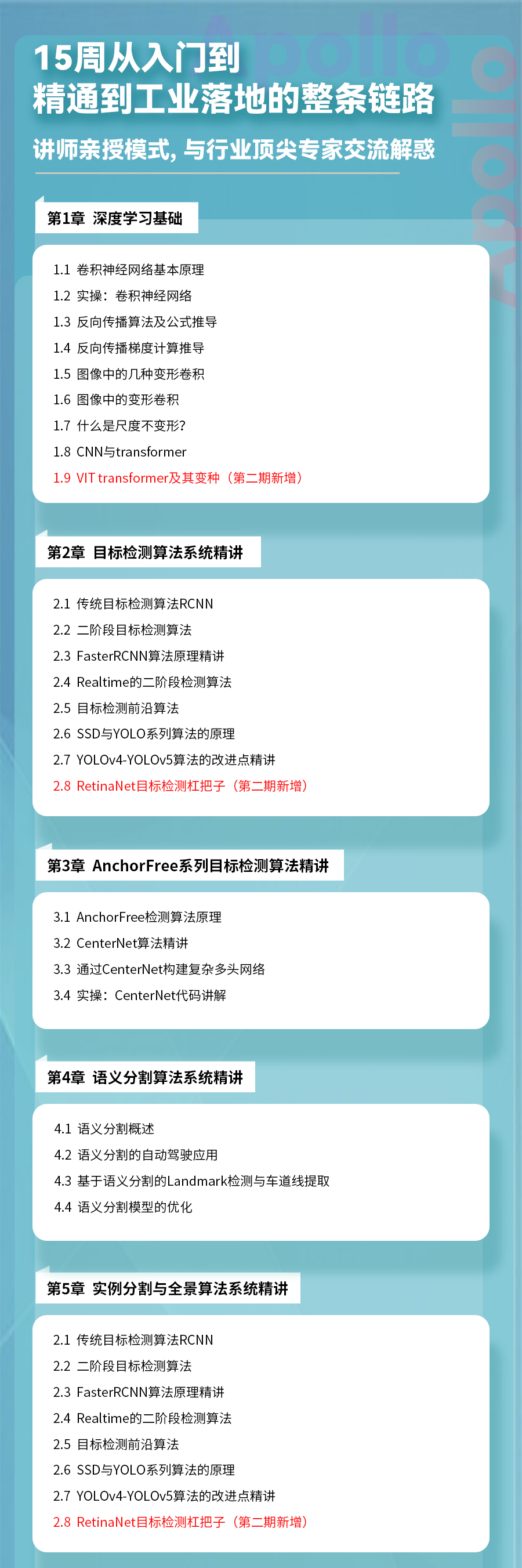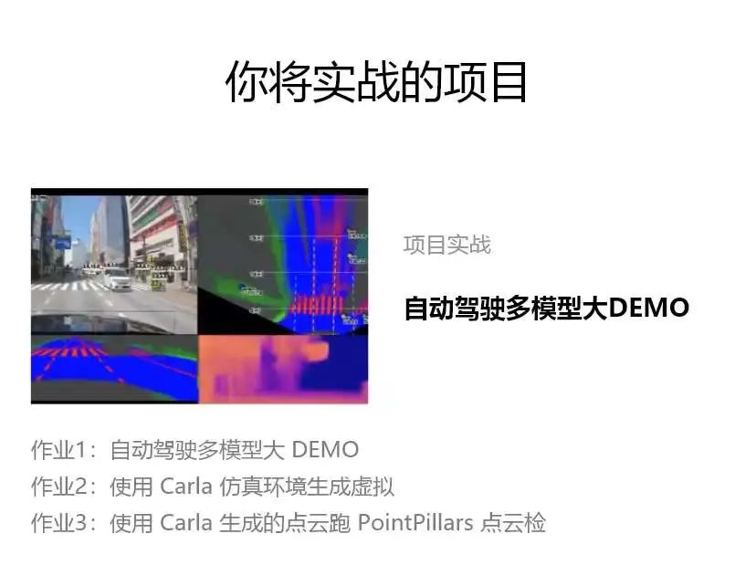 本课程几乎囊括了自动驾驶(AI)算法工程师需要具备的所有技能点,从最基础的神经网络原理到各种目标检测算法,再到最前沿的AI算法落地,剪枝量化与TensorRT并行加速,再到语义分割、实例分割、甚至是全景分割任务,最后落地到自动驾驶感知系统的构建、车道线检测系统、红绿灯识别与控制系统,深入的介绍每一个模块的的问题以及解决方法,深入的介绍每一个模块的的问题以及解决方法,让您无论是在学术领域还是工业领域,对自动驾驶感知系统都有一个高屋建瓴的理解和把握。
