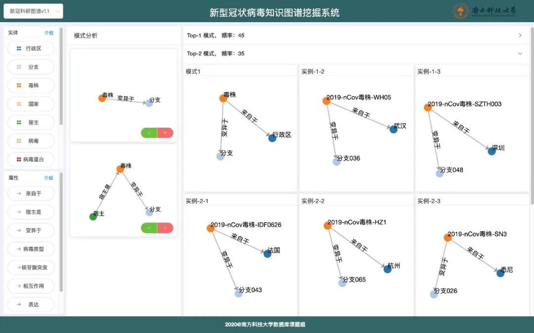 南方科技大学计算机系唐博教授领导的数据库研究团队与澳门大学智慧城市物联网国家重点实验室数据科学研究中心主任余亮豪教授团队紧急联合启动基于新型冠状病毒知识图谱模式挖掘系统(下称“新冠图谱挖掘系统”)的研发,目前新冠图谱挖掘原型系统正式推出,该系统实现关于新型冠状病毒的不同知识图谱的前K频繁模式的高效挖掘,为专业人士分析病毒相关问题提供决策依据。