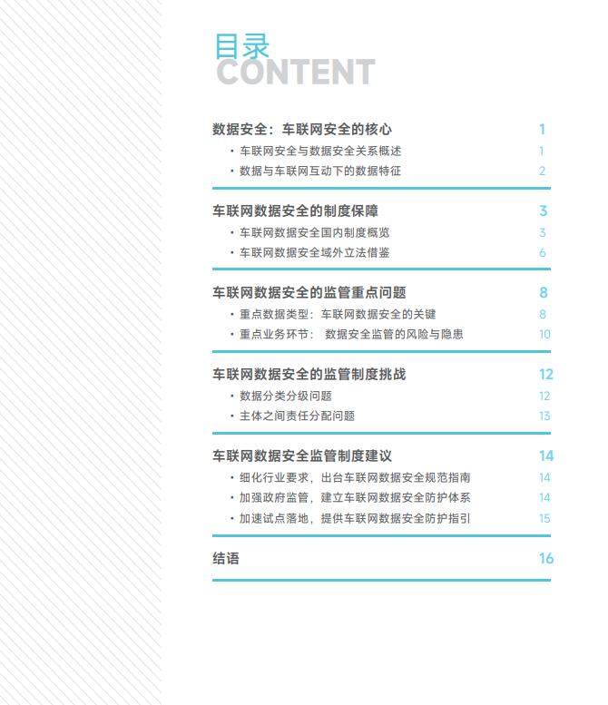 基于此,毕马威中国与观韬中茂律师事务所联合发布《车联网数据安全监管制度研究报告》。本报告对当前车 联网领域涉及的汽车数据类型、数据安全的监管现状、行业监管重点等问题进行梳理和分析,并提出监管建 议,希望能为社会各界提供借鉴和参考。