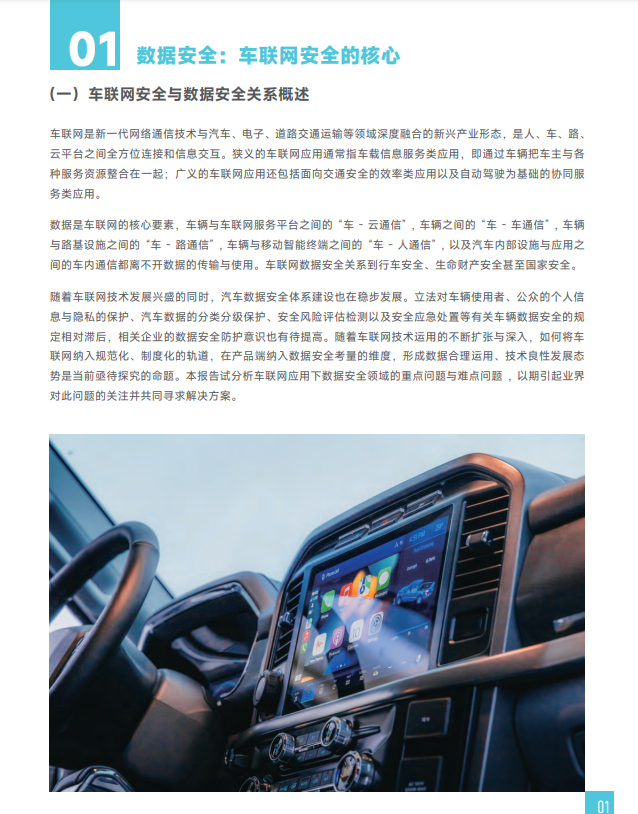 然而,智能汽车在车联网中扮演的角色将不仅仅是一般意义上的交通工具,为实现更多的功能与场景,智能 汽车正在成为深度收集、处理、传输和使用大量包含个人信息、汽车运行数据和环境数据的可移动、可交互 的汽车数据枢纽。汽车数据是车联网运行的关键,其中包含的大量重要数据将涉及到个人、车辆、企业以及 国家的安全。如何保障汽车数据安全,并在合规前提下,促进汽车数据的充分合理利用,逐渐成为关系到整 个车联网产业健康良性发展的重要课题。