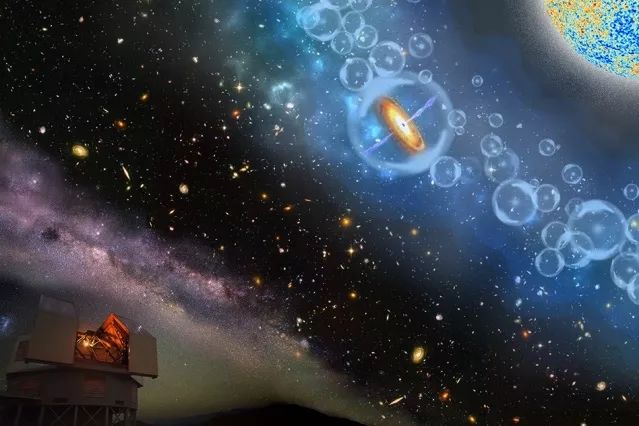 在大爆炸后,宇宙充满了炽热的高能粒子。随着宇宙快速的膨胀,这些粒子逐渐的冷却并凝聚成中性氢气,那个时期被称为黑暗时期。最终,在引力的作用下,物质凝聚形成第一批恒星和星系,产生了组成光的粒子——光子。由于越来越多的恒星在宇宙中被点亮,它们辐射出的光子与中性氢反应,将气体离子化,使宇宙迎来了再电离时期。