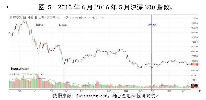 2015年政策发布后股市仍持续震荡下跌,下跌趋势持续半年之久(如图5所示)。我们清楚2015股市大崩盘的原因来自高杠杆的场外配资,涉及信托、银行、基金、证券公司等金融机构,由于受到证监会的约束和监督极少,通过场外配资大规模资金进入股市,托高股价。而股市的快速上涨背后带来的是泡沫的大量累积,在泡沫崩盘后其下跌幅度也越大和创伤修复时间也越长。