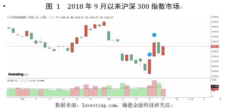 10月19日一行两会发声,国务院副总理刘鹤在接受记者采访时表态,要高度重视股市稳定发展。A股继上一周的暴跌趋势下,周五迎来首次反弹(如图1所示)。10月19日,沪深300指数涨幅2.97%,10月22日涨幅4.32%,收盘3270.27点。然而昨天,沪深300指数下跌2.66%,收盘于3183.43点,今日早盘上涨1.75%,收盘于3239.27点。股市从利好后的短线上涨进入目前的震荡趋势。