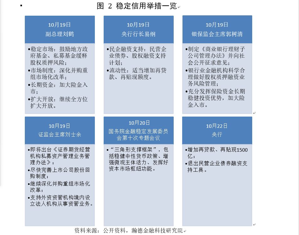 10月19日,副总理刘鹤、央行行长易纲、银保监会主席郭树清、证监会主席刘士余在接受采访时,均对近期股市的大幅波动及未来政策走向有具体回应。监管层、决策层声明的核心主题是“稳信用”(如图2所示),即减小民营企业大面积资金断裂的系统性风险,并且继续深化资本市场改革。
