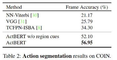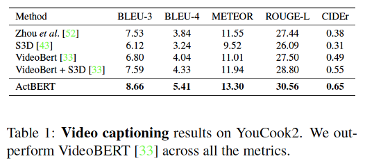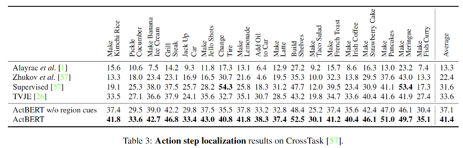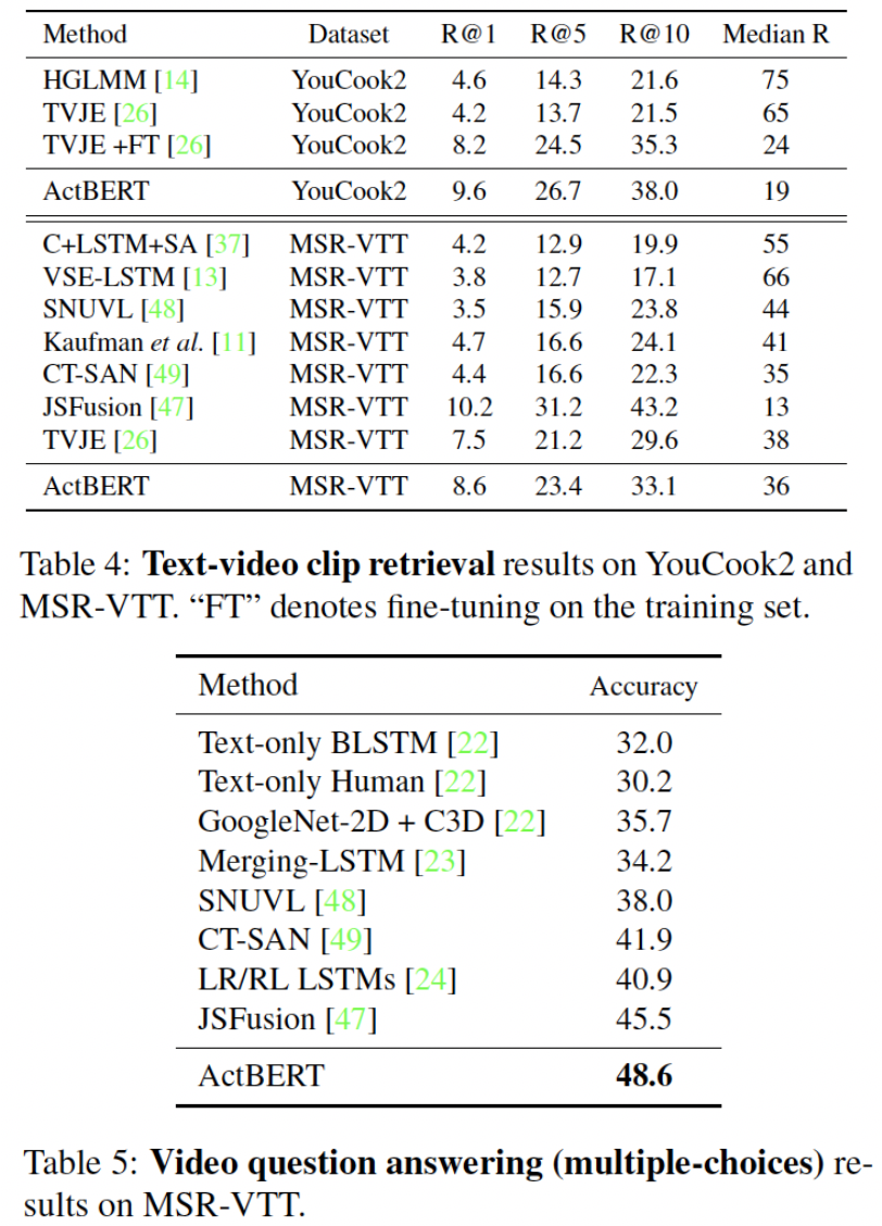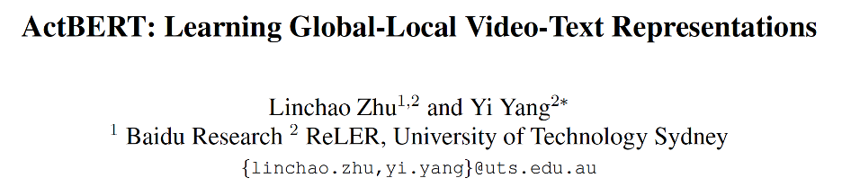 不需要复杂的联合视频文本建模,ActBERT 明显优于现有其他方法。表明 ActBERT 在大规模数据集上的强大学习能力。 结论 ActBERT 以一种自我监督的方式进行联合视频文本建模。该方法直接为全局和局部视觉信息建模,以进行细粒度的视觉和语言关系学习。ActBERT 将信息的三个来源作为输入,并使用了新颖的纠缠编码器进一步增强三个源之间的交互。五个视频文本基准测试的定量结果证明了 ActBERT 的有效性。未来可以通过设计更强大的视频和文本学习模块来提升 ActBERT,并将其应用到视频动作识别和检测中。 参考文献:Linchao Zhu, Yi Yang, ActBERT: Learning Global-Local Video-Text Representations, CVPR 2020.Antoine Miech et al., HowTo100M: Learning a Text-Video Embedding by Watching Hundred Million Narrated Video Clips, ICCV 2019.Chen Sun et al., VideoBERT: A Joint Model for Video and Language Representation Learning, ICCV 2019Linchao Zhu, Zhongwen Xu, Yi Yang, Bidirectional Multirate Reconstruction for Temporal Modeling in Videos, CVPR 2017. 本文为机器之心发布,转载请联系本公众号获得授权。 ✄------------------------------------------------加入机器之心(全职记者 / 实习生):hr@jiqizhixin.com投稿或寻求报道:content@jiqizhixin.com广告 & 商务合作:bd@jiqizhixin.com