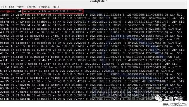 命令:macof -i eth1 -d 192.168.1.1