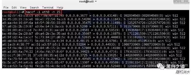 Macof可以使用随机MAC地址泛洪交换机。这称为MAC泛滥。这会填写交换机的CAM表,因此无法保存新的MAC地址,并且交换机开始将所有数据包发送到所有端口,因此它开始充当集线器,因此我们可以监控通过它的所有流量。