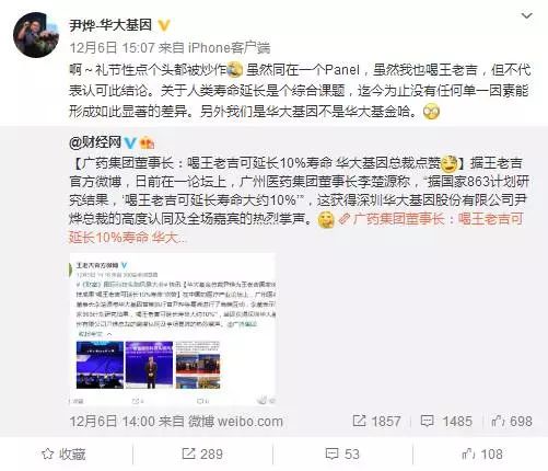 广药集团宣布“喝王老吉可延长寿命大约10%”后,立刻引发热议,有媒体质疑相关实验数据和论证过程。此外,王老吉官微消息称,华大基因CEO尹烨也在现场,并对此“高度认同”。不过,尹烨今日发布微博否认此事,他称,“礼节性点头都被炒作。虽然同在一个Panel,也喝王老吉,但不代表认可此结论。关于人类寿命延长是综合课题,迄今为止没有任何单一因素能形成如此显著的异。”