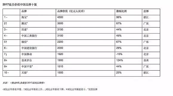 8、2017年胡润品牌榜公布,淘宝、腾讯、百度位列前三