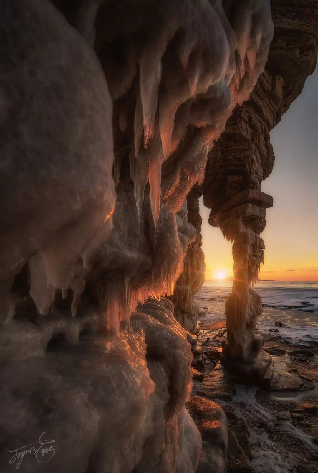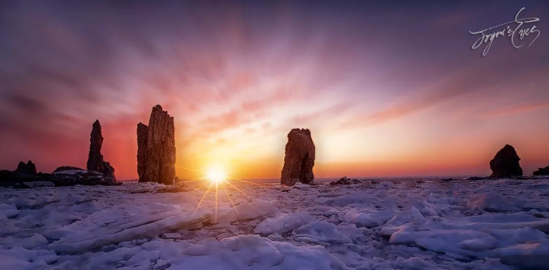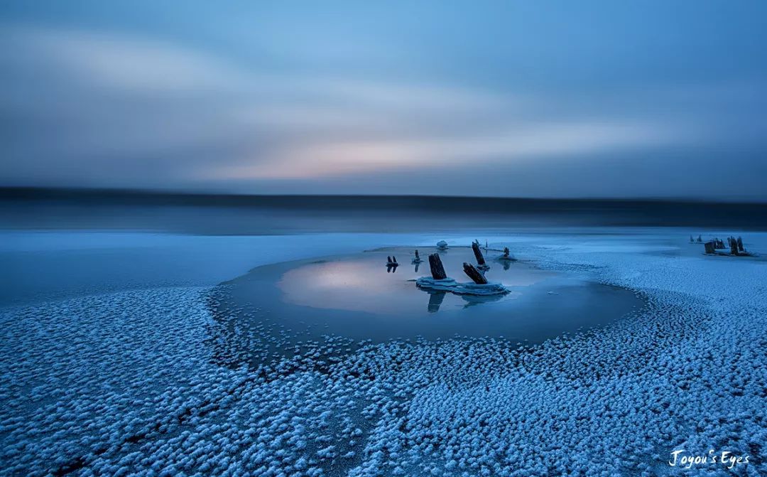 在北方冬季拍摄冰海的时候,一定要熟悉潮位信息,有的时候表面上看着已经冻实了的海面,随着涨潮,海冰也会被海水浸湿,掏空,一脚踩下去,可能直接掉进海里,危及生命。