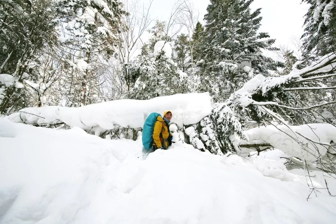 汗液带走大量热量。所以我不穿羽绒服,避免运动过热,避免徒步一身汗,拍摄冰冰凉。这就是我说的动态保暖,通常在运动状态下我会选择的户外衣服是哥伦比亚热反射内衣。徒步鞋也是哥伦比亚热反射靴,而且这么深的雪徒步,要有雪套,避免雪倒灌进。