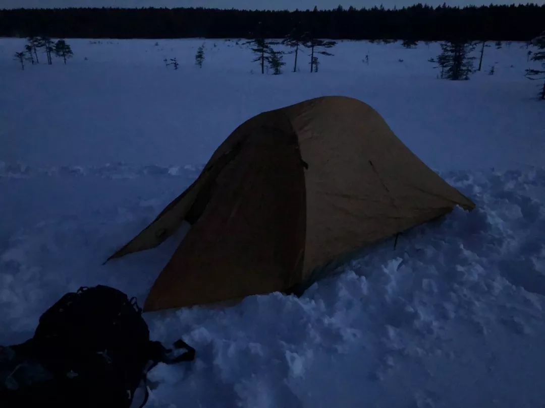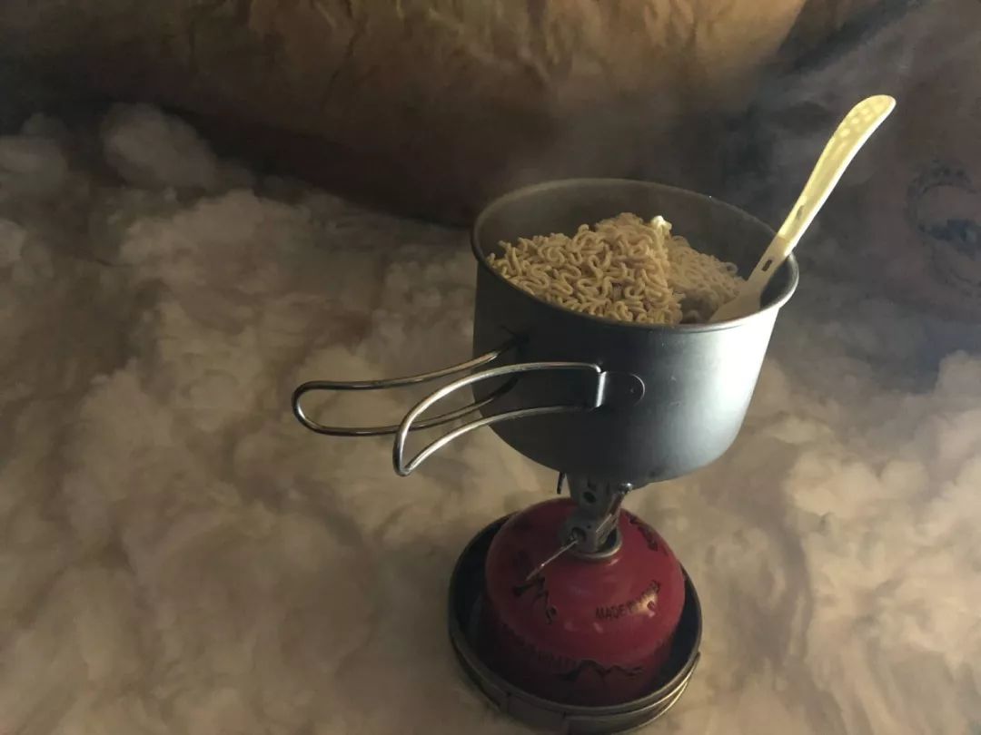 但是到了晚上风很大,吹得帐篷好像马上要散了,我冻得要死,只好想办法不让自己冻死在这里,还好我带了气罐和烧水的户外炉头和锅,我打算融化一些雪水,烧成热水,灌在保温杯子里,喝一点热水,然后多余的水可以放在杯子里,把杯子当做热水袋,放在睡袋里,让自己暖和起来。
