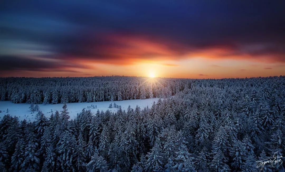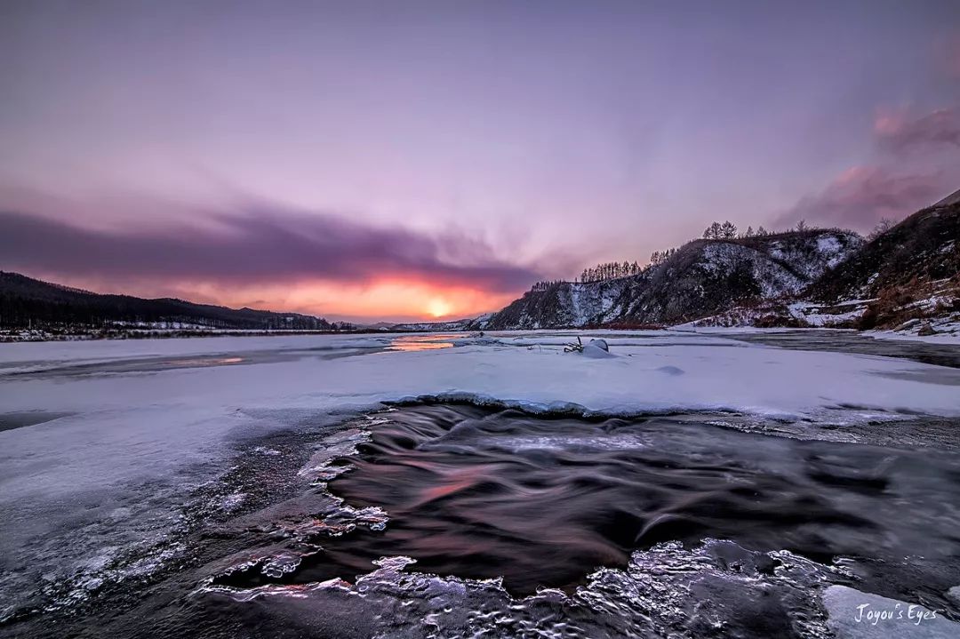可是气温实在太低了,气罐的气不能气化,气罐根本点不着,我就用手搓,摇晃着气罐有10分钟,终于气罐燃起来了,也成功烧出些雪融化的水取暖,就这样成功在林海雪原里面露营了一晚,天道酬勤,第二天早上给了个非常好的火烧云天气,我徒手爬上防火瞭望塔,拍到了这张林海幻境。