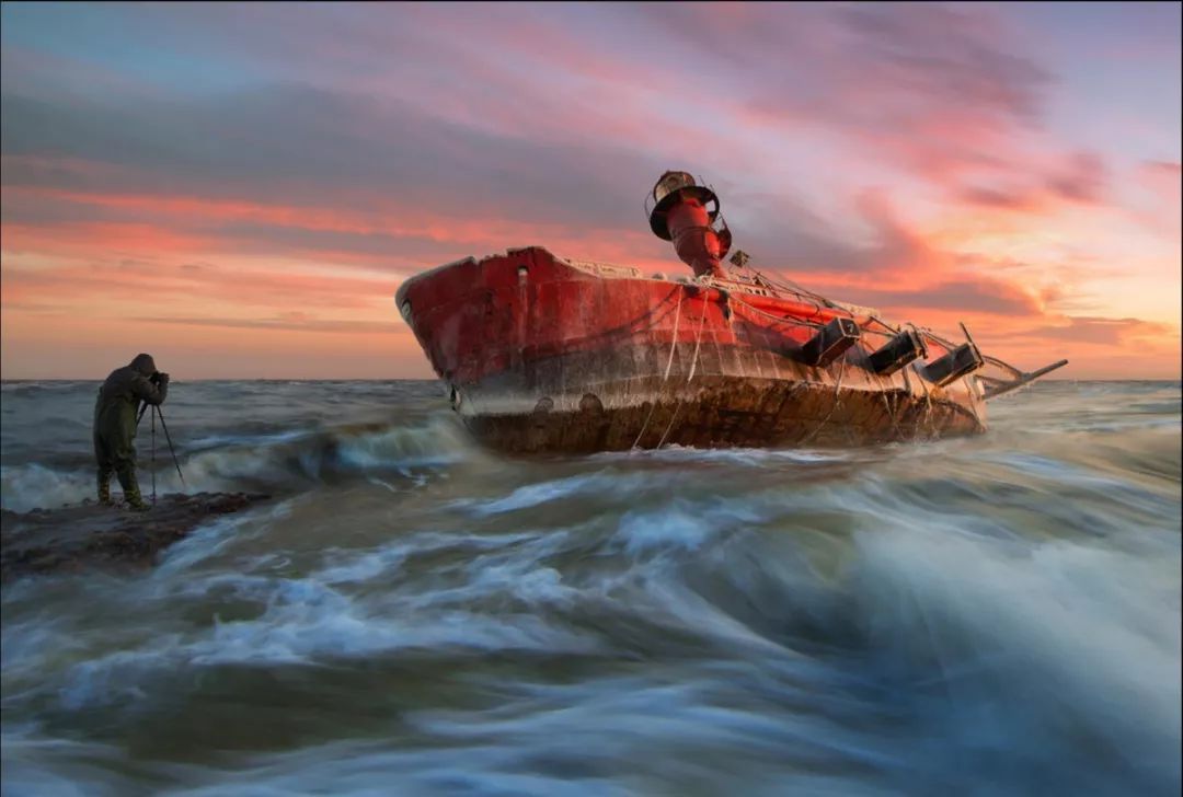 但是回撤的时候差点丢了小命,海浪很大,浮冰摆动的厉害,把我直接晃进了冰海里,我右手这时候还拿着RRS-33这么大的脚架包,不能游泳,而相机包背在背后,在危机关头我还是先把脚架包先抛在浮冰上,自己奋力的游泳,让后背尽量不沾水,可能是生存的本能,也顾不得冷,终于手抓住浮冰的边缘,爬了上去,要是浮冰把我挤在海底,我估计真的挂了,这是离死亡最近的一次拍摄。
