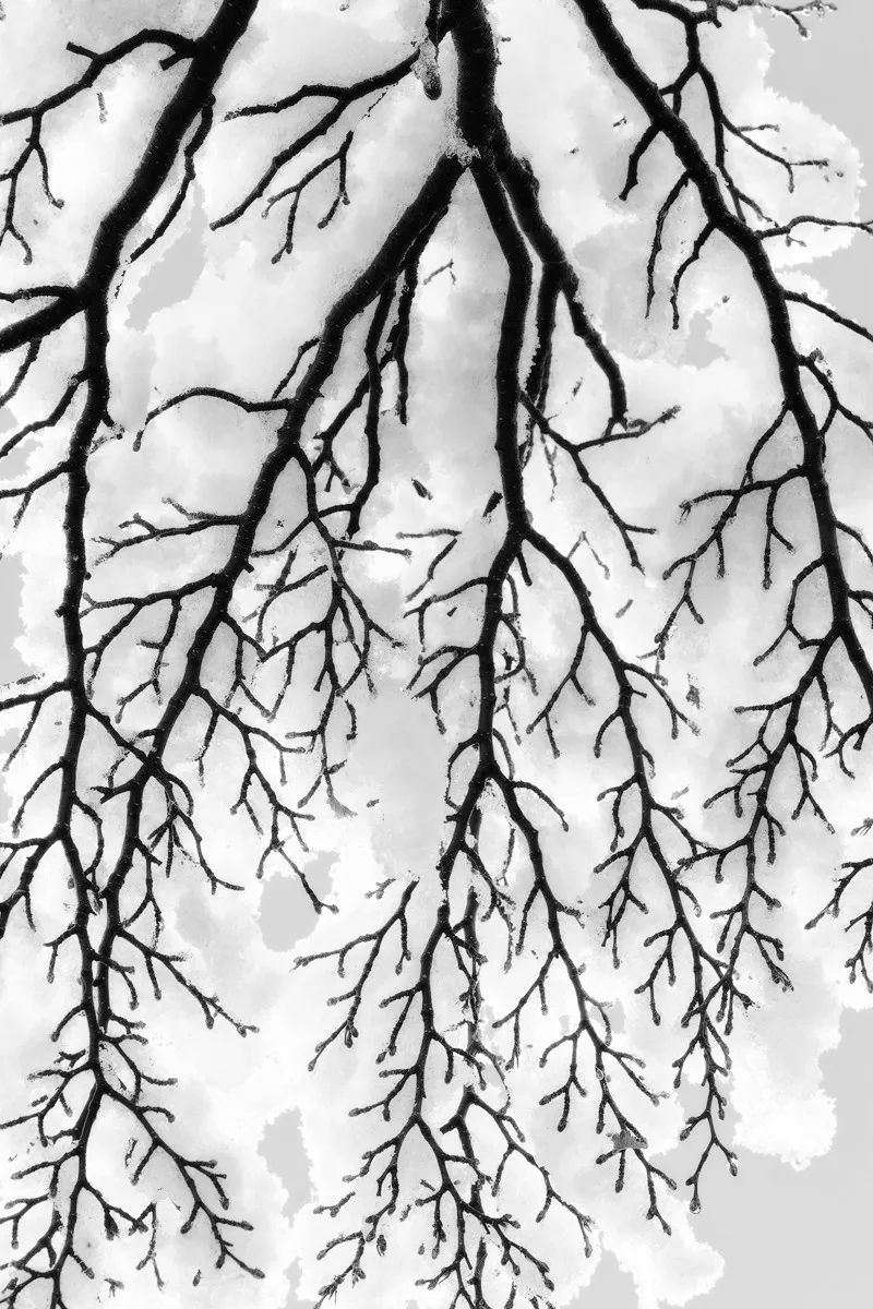 风光不只是大广角,这些非常有意思的长焦小景会让你的片子与众不同且难以复制。第一张《雪脉相连》拍摄于南美刚刚下过雪的早上,雨夹雪将光秃秃的黑色树枝覆盖,从树底下看过去非常有趣,于是我换上100-400GM这枚镜头,拍摄树枝的局部,黑白的反差和树枝像河流一样相连,最后海纳百川的姿态让我觉得这张片子非常的与众不同。