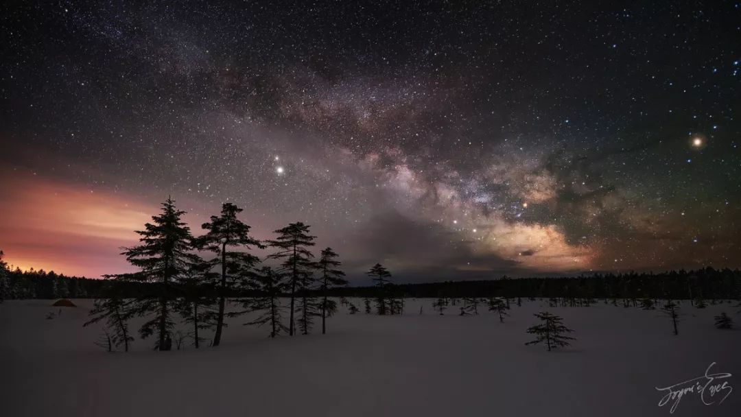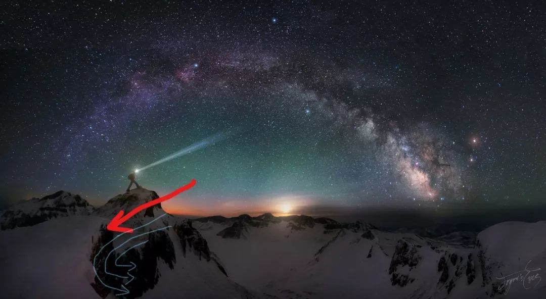 凌晨3点银河就要升起,我还赶着时间拍摄,带着这么多器材到了半山腰我也气喘吁吁,体力不支,这时候只有舍弃一些不必要的器材了,轻装上阵,于是我选择把大的三脚架和赤道仪扔到雪堆里,等下山的时候回来捡(反正半夜荒山野岭也不会丢),就这样经过近3个小时的徒步登山在银河升起前,按时赶到了山顶!