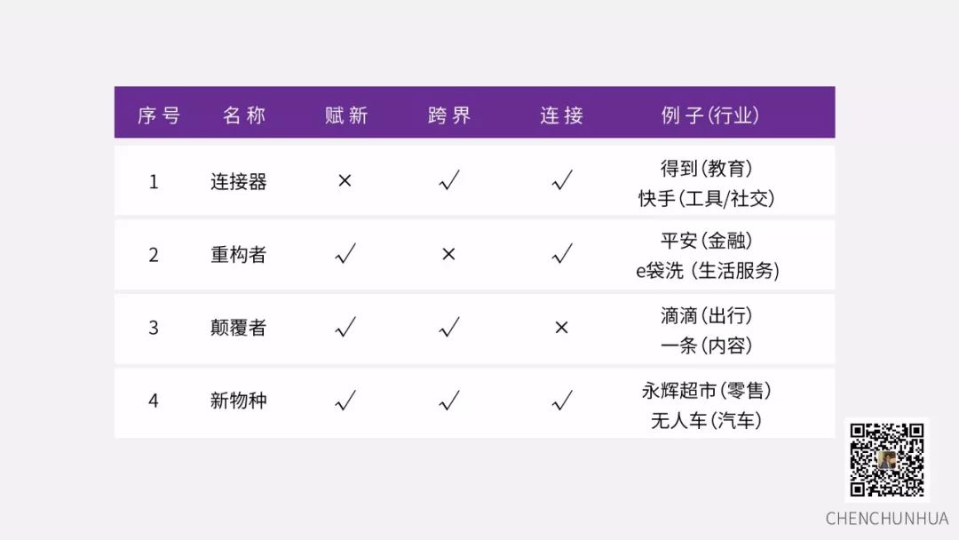 4.新物种。第四种组合是同时在「赋新」、「跨界」和「连接」这三个维度上进行突破。它重新定义了客户的需求,重新定义了产业,也重新定义自身的资源能力边界,因此可以被称为「新物种」。