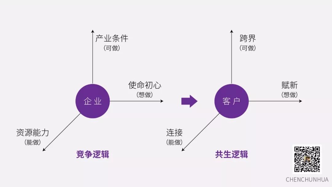 而基于「共生逻辑」的认知框架则是站在客户的立场,考虑的是:客户需要更新哪些价值主张、赋予什么新义?如何跨界进行价值的重组?连接哪些资源能力以满足新的需求?在这个系统中,客户走到了中央的位置,成为了企业关注的核心。这也呼应了数字化时代终究会回归到「以人为本,由物到人」的规律。