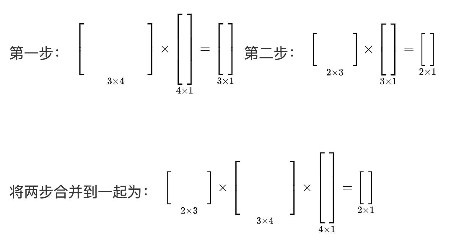 通过以上形式,我们可以发现如果将一个列向量经过多次线性转换,他的顺序应该是从右至左的顺序。这就是标准的线性代数书中所讲到的连续线性变换的形式,从右至左也是线性代数数学家习惯的顺序。