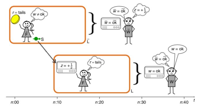Frauchiger和Renner的思想实验更复杂,他们扩展了维格纳的实验,在他们的系统中,存在两个“维格纳”,每一个都在进行一项让自己的物理学家朋友待到盒子里的实验。其中一个朋友F‘会抛掷硬币,并利用她的量子力学知识给朋友F发送一则量子信息;F则利用自己的量子力学知识来识别F‘的信息,并猜测她投掷硬币的结果。