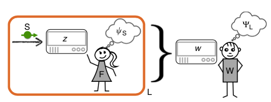 ○ 维格纳的思想实验:F在垂直方向上测量一个银原子的自旋S,获得结果z。从F的角度来看,S的自旋是一个已知的纯态。在盒子外面的W,会将包括F在内的整个盒子视为一个大的量子系统L(橙色盒子),因此W会给系统L指定一个叠加态。| 图片来源:[1]