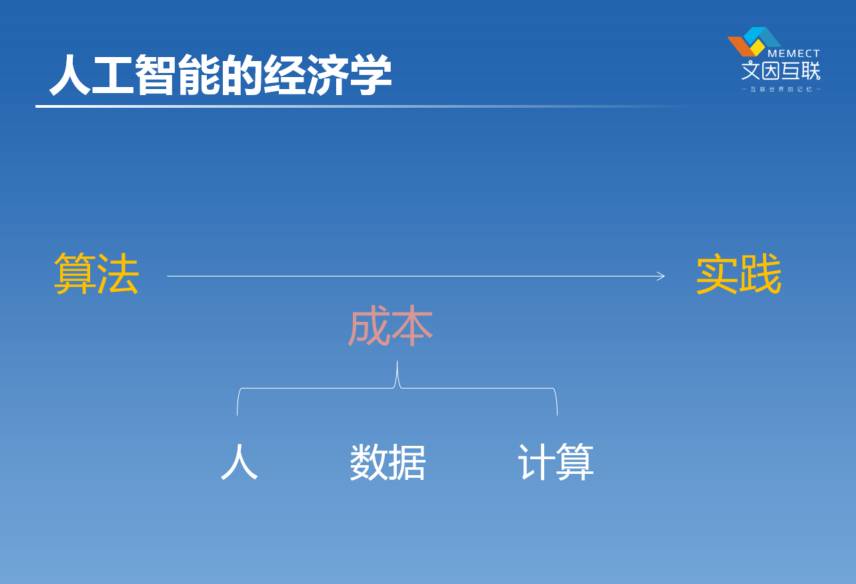 我们从一个算法到实践,都需要付出成本,我们怎么降低这个过程的成本,在我看来是人工智能这个算法能不能有生命力的关键。我把成本分为三个大的部分,人的成本、数据的成本、计算的成本。计算的成本是很好理解的,机器跑的时候要费电、机器要花钱,现在我们虽然有了云计算了,那还是个机器,也是要花钱的。好在我们有摩尔定律,这个成本是不停地指数在下降的,这个是非常坚定的在过去几十年不停的变化,这是好办的。