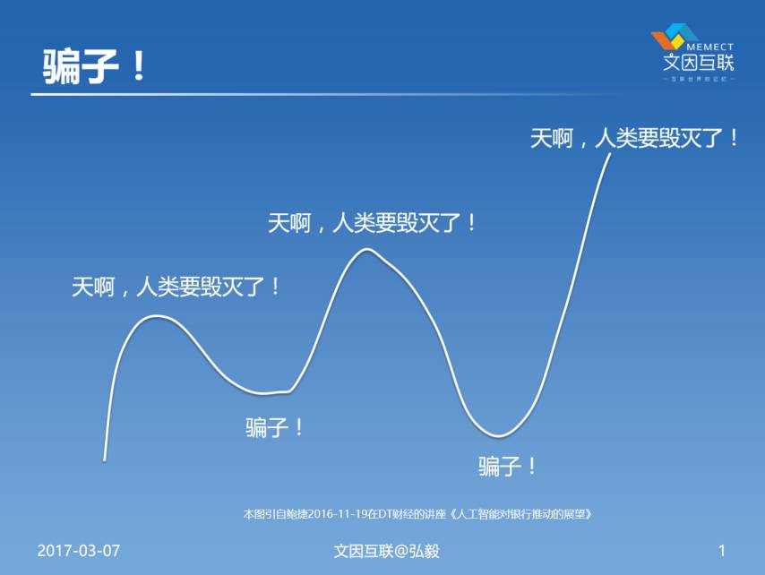 下面这个图是我在三个月之前在DT财经的讲座里面画的。这个图差不多就是过去30年来,我们整个领域的血泪史吧。媒体一会儿说你们这一群人要毁灭人类了,然后又过了十年说你们是一群骗子。我最早接触人工智能到今年已经20年时间,经历了两个轮回,被鄙视了两次。