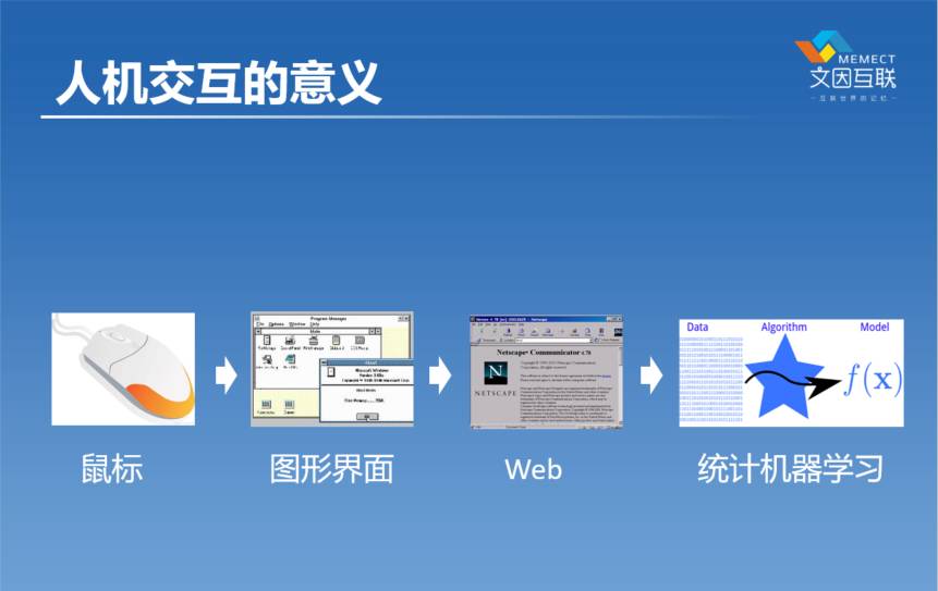 刚才提到了互联网带来的数据是为什么机器学习兴起的原因。我们深入去想一想,再前面的那些原因是什么?我们可以追溯到鼠标的发明者,这是一个很长的链条了。我们有了鼠标,我们才有了图形用户界画,我们有了图形用户界画,我们才会有了Web,你能想象一个没有图形用户界面的浏览器是什么样子吗?这东西是存在的,真的是存在的。比DOS还要再老,这样一种东西,会让普通的千家万户的人去用吗?不可能。正是有了前面人机交互的进步,所以我们才会有了千家万户的,每个人都会用的互联网,所以才会有了数据,所以统计机器学习才成为可能。