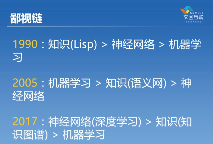 知识这个领域,也在十年的消沉之中恢复起来了,摇身一变换了一个名字叫知识图谱。2012年前后几个大的公司,把这个东西带起来,现在反而是机器学习,在整个鄙视链里面往下降。这就是咱们的钟摆,就是人工智能整个领域是起起伏伏的,人工智能里面每个学派本身也是起起伏伏的。