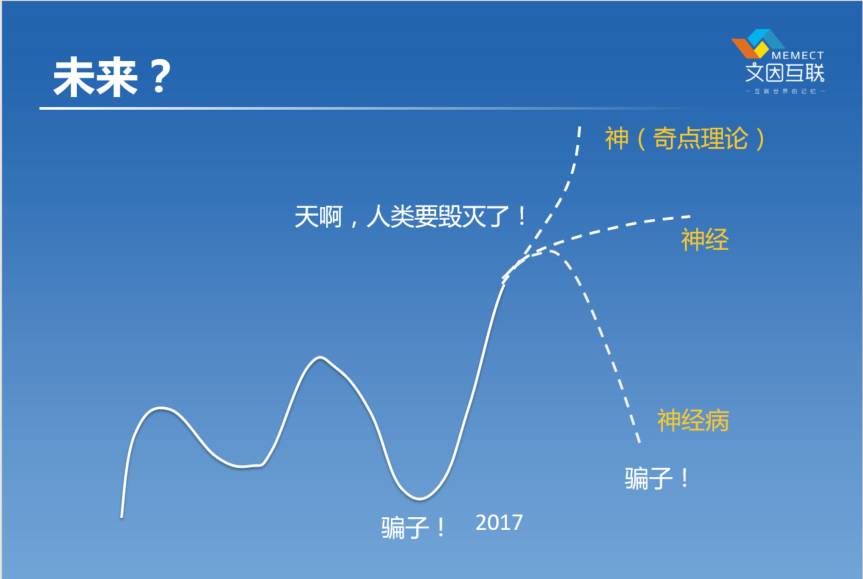 我觉得很有可能的,虽然是很不幸的,是10年之后,可能更多人叫我们是骗子。因为最近几年是太热、太热了。《未来简史》这本书,它的副标题叫“从智人到智神”,这本书有多少人听说过?4个。我也是前天才买了一本,在来的火车上还在读。我之前读了《人类简史》这本书,《人类简史》那里面讲了很多人类的未来会怎么走,《未来简史》接着往前推他的推论。但是在我看来,他讲的东西,我也不是很信服的,因为他在讲人和机器最后会融合,我们的大脑,我们的四肢全部变成一个机器,搞成一个怪物出来,他把这个东西称为“智神”。