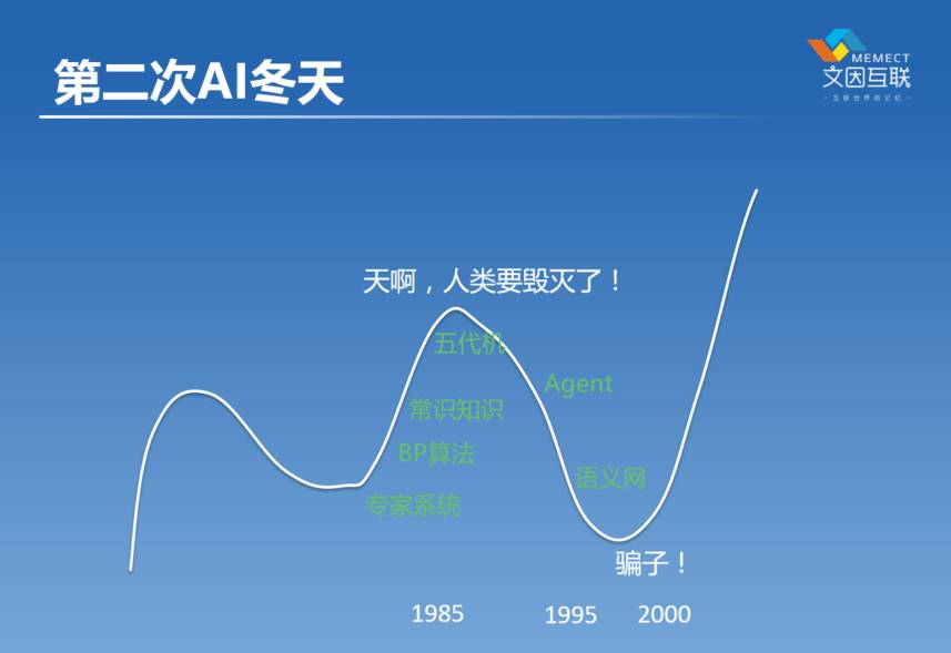 Church把这个机器学习的这个上升过程放到整个历史进程里面来看,大概从40年代到现在,他认为这个上升,实际上是对前面这20年下降的一个弥补。但他又认为有可能往后是往下掉的。事实上这篇文章从2007年到现在已经过了十年时间了,我们可以看到他的预言确实是对的,现在机器学习又在往下掉。所以你看现在的文章里,越来越多的在讲神经网络,在讲逻辑,在讲知识图谱。因为有了这样的起起伏伏,我们就有了所谓的“人工智能的冬天” ——AI Winter。到目前为止我们经历了人工智能的三次高潮、两次冬天,到底下面一个是什么,我们现在还不知道,但看看历史或许能够有助于帮助我们理解未来。