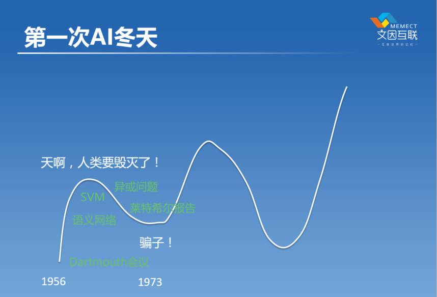 所以大家在一起就1956年他们花了大概一个多月的时间,在Dartmouth学院这个地方一起讨论,最后就形成了这个学科。形成这个学科之后,大家非常兴奋,以前从来没有想过机器可以模仿人的智能,所以当这一件事情已经发生了之后,大家就觉得好像我们对于用机器来解决我们现在面临的各种复杂的问题,已经有答案了。60年代的时候,我们有了语义网络,有了SVM,有了逻辑,有了神经网络,我们有了各种统计的方法,我们用了很多算法,感觉好像胜利呼之欲出了,所以当时的人非常非常的乐观。应该是明斯基说的,他的想法是说,“十到十五年之内我们可以解决所有的智能问题”。从下棋开始,所有问题我全部能解决掉。