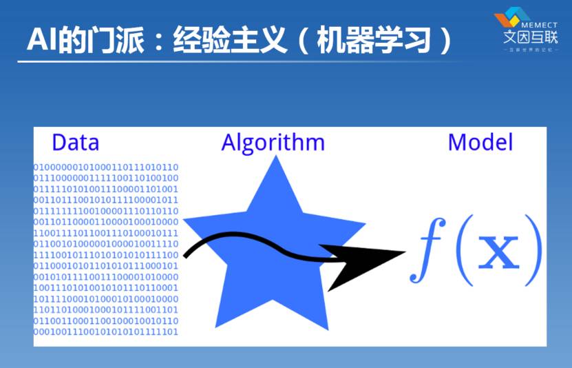 第一个门派我们称为经验主义,最经典的代表就是机器学习。机器学习可能有一万个不同的变种,我们把它抽象到最抽象的角度,其实就是这一幅图讲的东西,它就是在学习一个函数。我们高中时候都学过函数。输入是什么,输入就是图中“010101”这些数字,图像也好,声音也好,文本也好,都是数据。那通过所谓的算法,我们去逼近这个世界上存在的一个函数,这个就是机器学习。什么样的东西是函数呢?比如说我们在座的各位,我们大家每一个人都有一张脸,我们做一个人脸识别,我们识别出来这是女生,这是男生,这就是一个函数,这个函数的输出是0或者1,这是一个所谓的分类问题。当然现实中我们遇到的分类问题,会比这复杂很多,可能不是分两类,可能是分一千类。
