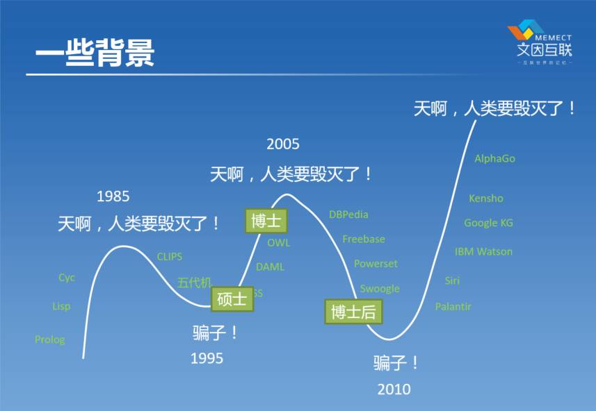 我去美国的时候,2001年,那时候是神经网络的一个低谷期。我去美国就是因为我的微博导师 Vasant Honavar 是做神经网络,所以我就申请跟他做。去了以后他就告诉我,咱们不能研究这个方向了,这个方向拿不到钱,你得换一个方向。那我想想换什么方向,最后我选到了语义网这个方向,结果等我毕业的时候,语义网热度低。所以说人的命运要看个人努力,但最主要的还是看历史的进程。