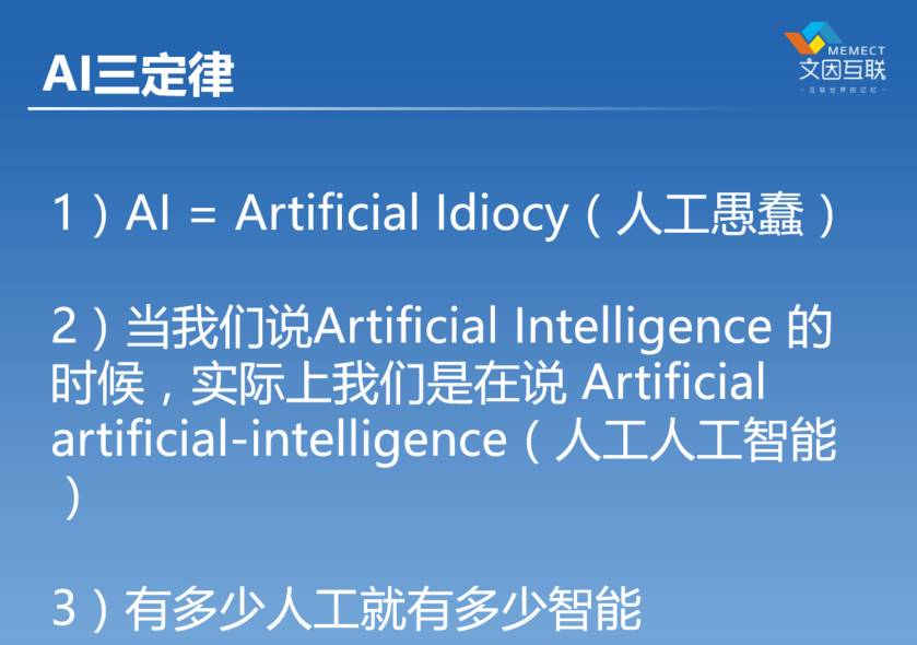 第一个定律是说 AI 不是 Artificial Intelligence,是 Artificial Idiocy。还有人说是动物智能(Animal Intelligence),我觉得这是比较靠谱的一个说法,就是现在我们所谓的人工智能,我们看到AlphaGo 这些东西,其实它都是很机械的一种,它只是速度很快,我觉得它的智能水准基本上就相当于一个蟑螂。我觉得能到蟑螂就算还不错了,然而它并没有真正达到人的智能,其实连高等动物的智能都达不到。