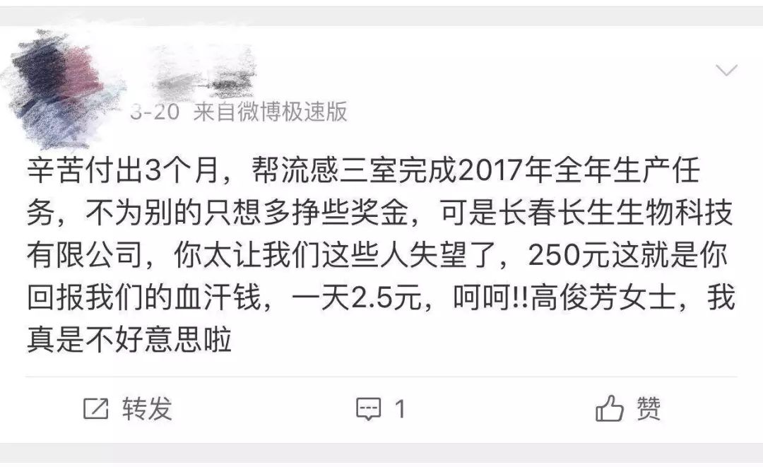 7月17日,在社交媒体上,一位自称长生生物的员工爆料:“辛苦付出3个月,帮流感三室完成2017年全年生产任务,不为别的只想多赚些奖金,250元就是你回报我们的血汗钱,一天2.5元。”AI财经社曾对该名员工身份进行确认,截至发稿,对方未回复。