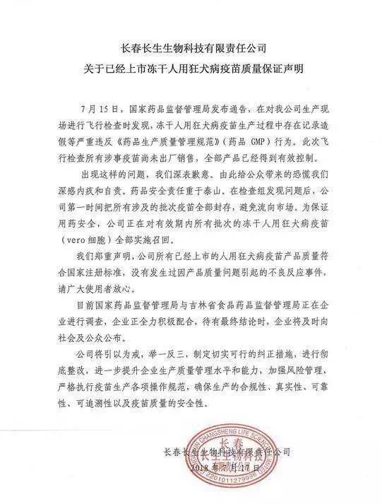 17日,长春长生生物在官网发布声明道歉,“此次飞行检查所有涉事疫苗尚未出厂销售,全部产品已经得到有效控制”,“在此期间,已上市狂犬疫苗符合标准,请放心”。