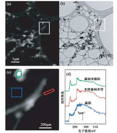 Braun等人比较了TEM-EELS(透射电子显微镜 - 电子能量损失谱)的组合和STXM -XANES(扫描透射 X 射线显微术-X 射线近边吸收谱)的组合以及常规的 XANES三种探测手段在研究碳材料中的优劣,发现 X 射线吸收谱能够探测一些表面结构如羧基和碳氢键等,而 EELS则很难给出相应信息. 在长期研究和发展STXM 技术的基础上,Felten等人用这种实验手段研究了空间分辨的碳纳米管的电子结构. 他们用透射电子显微镜(TEM) 首先确定研究区域的大致形貌, 再结合STXM 的元素成像功能找到相应区域,以30nm 左右的空间分辨率得到了单根多壁碳纳米管的 X 射线近边吸收谱(见图2). 实验发现,碳纳米管的电子结构和其周围无定形碳纳米颗粒的电子结构有极大的差别. 这种 TEM-STXM-XANES方法能够有选择性地对 30nm 左右大小的区域进行吸收谱分析,可以单独地对所需要的目标进行分析,而不同于以往得到的不同物质的混合体,这对于制备过程中多种结构混杂在一起的碳纳米管的研究是非常有意义的. 在随后的研究中,他们利用这种研究单根碳纳米管的优势,分析了不同制备方法得到的碳纳米管在电子结构上的不同,并利用同步辐射光的偏振性研究了碳纳米管的多种性质.Zhou等人利用STXM 研究了掺 N 的碳纳米管的电子结构 ,并发现在制备过程中多壁碳纳米管管腔内封装了部分氮气,实验很好地展现了STXM 在结合了空间分辨和谱学分析后的强大性能,清晰地观察到了碳纳米管管内封装的氮气和管壁上掺N的部分的不同,并且以30nm 的分辨率得到了这些不同成分在空间上的分布. 此外,STXM 在研究碳纳米管与纳米颗粒的相互作用方面也有很好的作用 , 我们利用STXM 研究了碳纳米管表面覆盖的碳碎片结构,并系统地探测了不同纳米颗粒与碳纳米管的相互作用形式和强弱,图3是我们得到的碳纳米管氧化与未氧化部分的成像和吸收谱图. 最近的文献已经发展了应用于STXM 的原位装置,可进行原位高温通气体的纳米催化剂动态过程研究,结果发表在 Nature等杂志上.