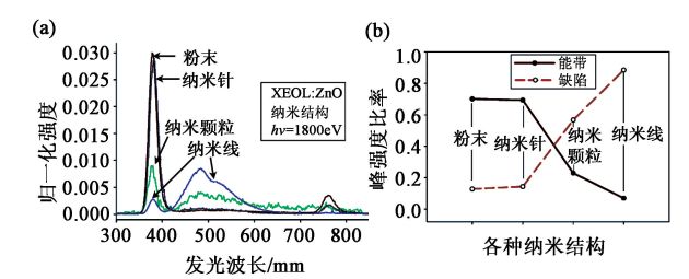图4 (a)不同形态(粉末、纳米线、纳米颗粒和纳米针) 的 ZnO纳米材料的 XEOL谱图;(b) 不同形态的 ZnO 纳米材料 XEOL谱中两个峰 (从左到右,两个峰分别代表能带跃迁发光和缺陷发光)强度的变化