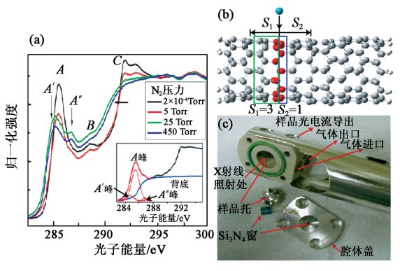 图1 软 X射线谱学气体原位装置用于碳纳米管与气体的相互作用研究(a)不同氮气压力下碳纳米管的碳边吸收谱;(b)气体原子与碳纳米管的碰撞理论模型;(c)软 X射线谱学原位装置图