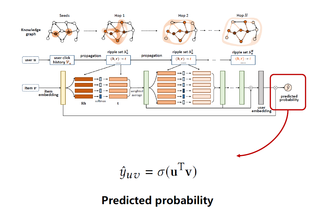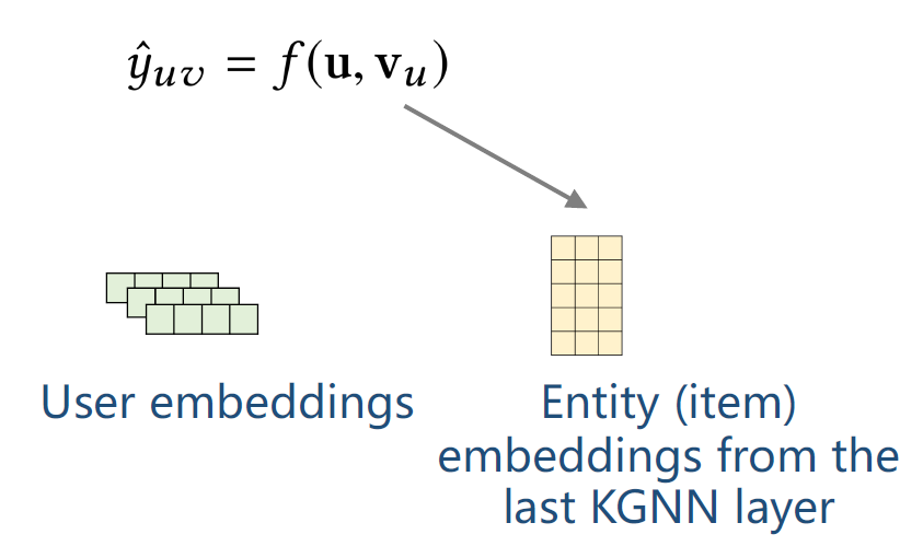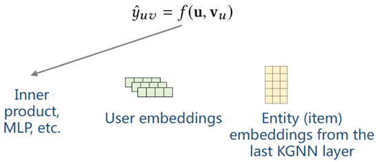 通过f函数得到预测值,f函数可以取内积,或MLP等。到这是第1篇论文的KGCN模型。
